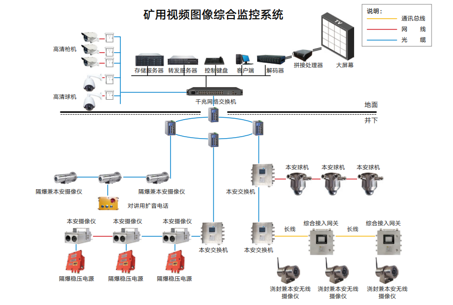 矿用视频图像综合监控系统可以对全矿范围内的重要场所进行视频监控、现场对讲、声音拾取。系统实现井下固定机电硐室内矿用本安球机 360°视频全景监控;实现在井下无极绳绞车、斜巷绞车、电机车场景的矿用本安摄像仪视频监控;实现在掘进工作面、综采工作面场景下透雾成像、智能除尘、防振动设计的浇封无线摄像仪等功能。在传输方面,可根据现场实际场景在大巷内使用光纤传输,在掘进面、采煤工作面等条件复杂区域使用双绞线电缆传输(长线),在工作面迎头使用 WIFI 信号覆盖下的无线传输。 |