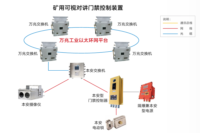 矿用可视对讲门禁控制装置是安装在固定硐室门口,实现无人值守场所的门禁控制。支撑了《智能化煤矿建设指南》中实现固定岗位无人值守要求和提高固定硐室安全管理水平需求。 矿用可视化门禁控制装置主要由矿用本安型门禁控制器、矿用隔爆兼本安型直流电源、磁力锁、门禁卡等组成。外围设备包含防火栅栏门,矿用本安型交换机及矿用线缆等。 |